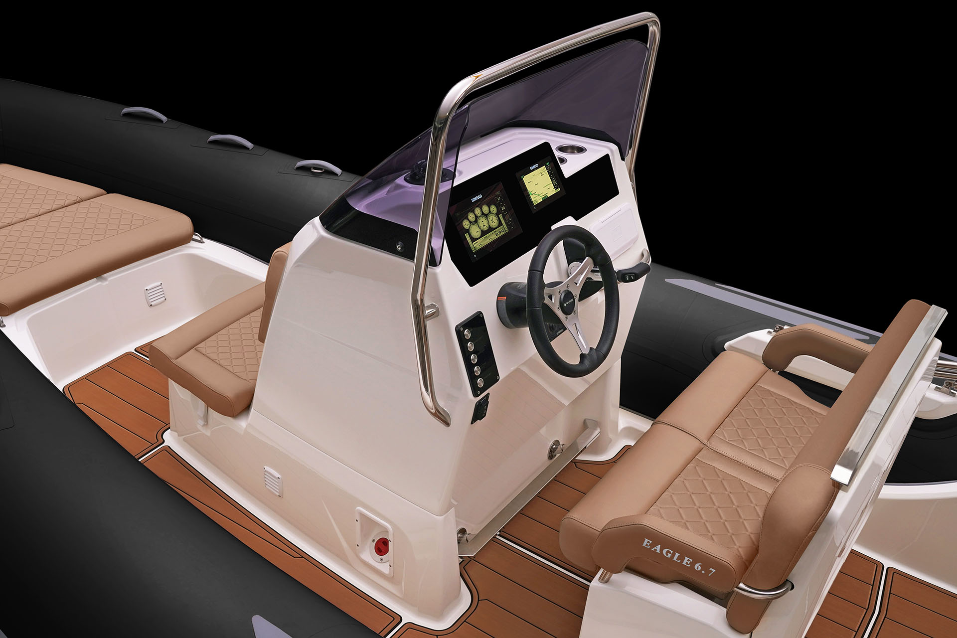 De Eagle 6.7 heeft een goed doordacht bedieningspaneel met een elegant dashboard waarin de instrumenten naadloos kunnen worden geïntegreerd. Zowel in de console als in de ruimte onder de zitbanken biedt de Eagle voldoende opbergruimte. In het voorgedeelte van de boot kan een groot zonnedek geplaatst worden om heerlijk te zonnebaden.