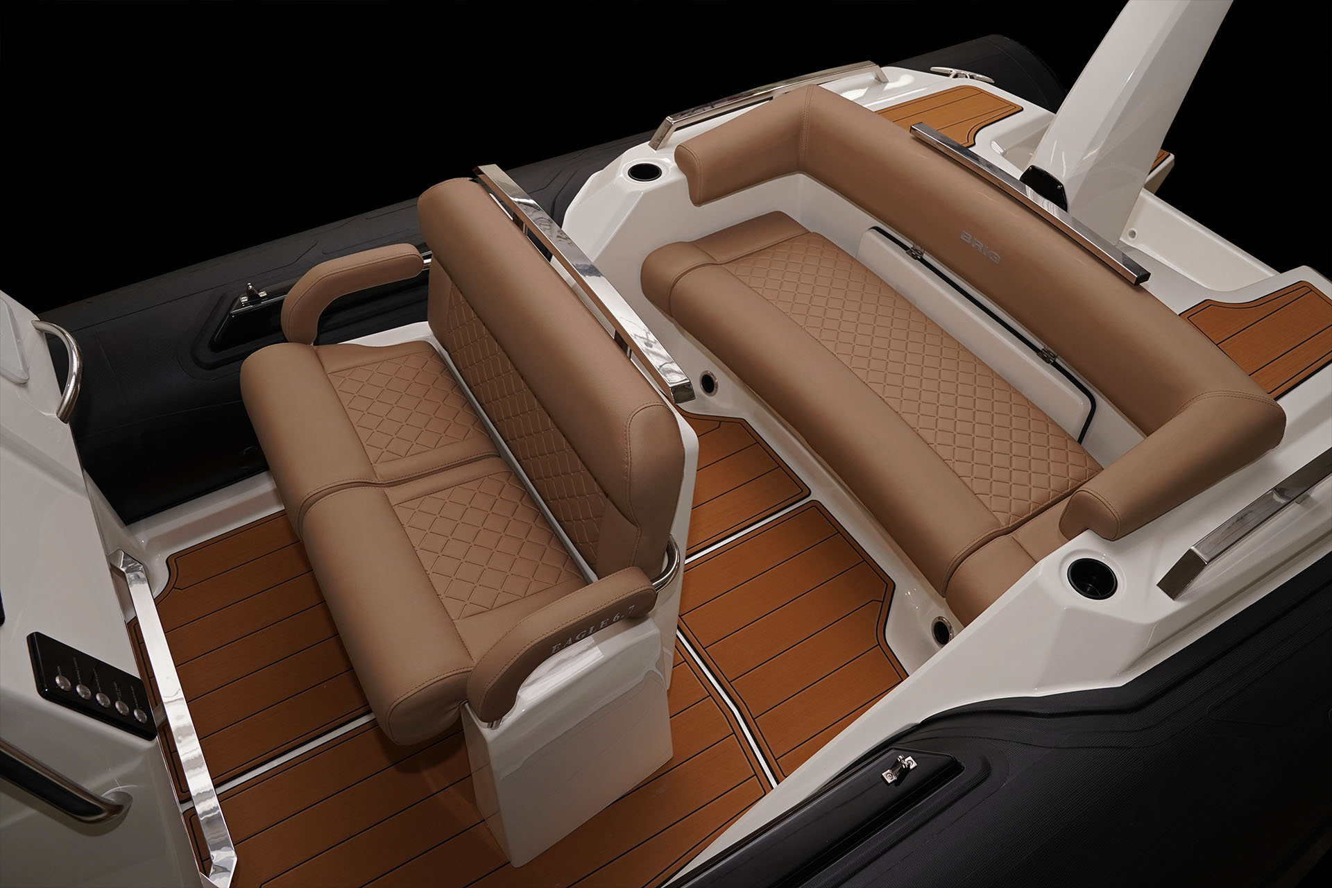 Een tafel kan snel worden uitgeklapt vanuit de bestuurdersbank. Een zwemplateau met opklapbare roestvrijstalen zwemtrap is onderdeel van de standaarduitrusting.