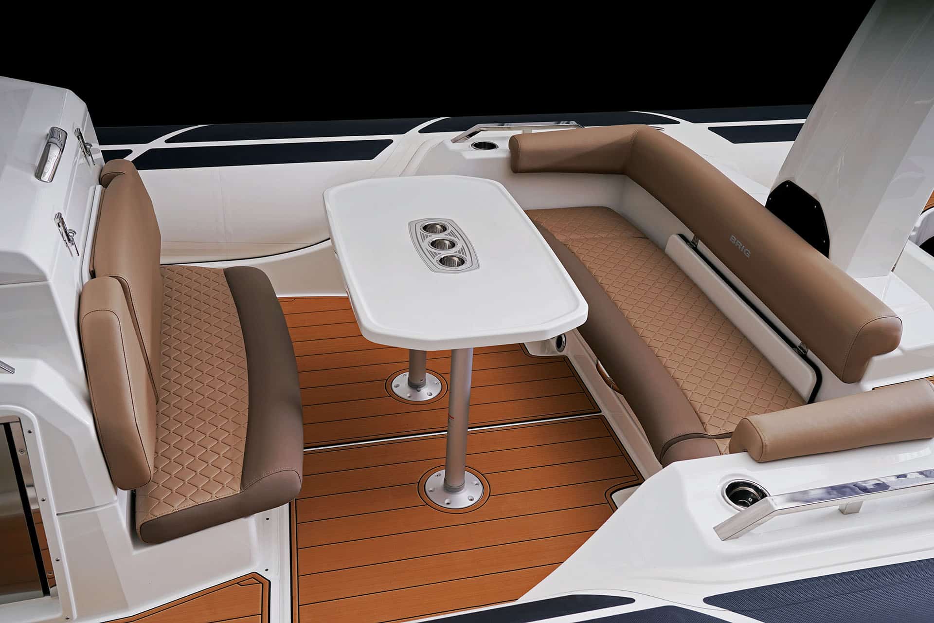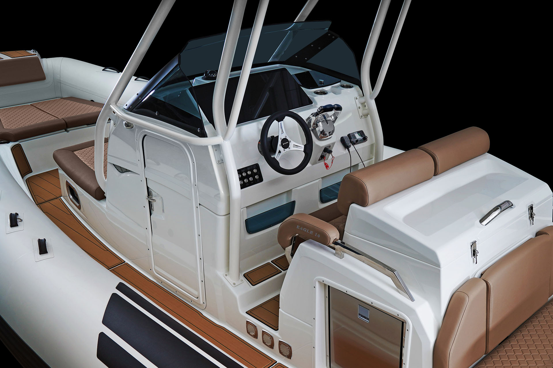 De standaarduitrusting van de Eagle 10 omvat hypalon ORCA® tubes, een waterskimast, toilet met vuilwatertank, een elegant dashboard waarin de instrumenten naadloos kunnen worden geïntegreerd met schakelpaneel.